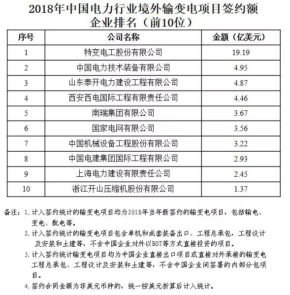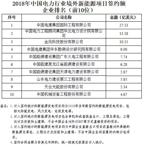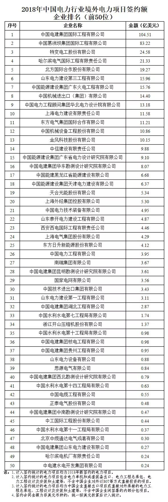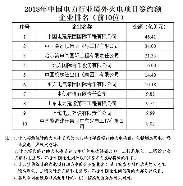 2018年中国境外电力项目签约额企业排名