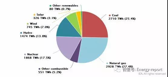2018年,天然气首次超过煤炭成为经合组织的主要电力来源,占总发电量的27.4%,煤炭占比25.4%。与此同时,所有可再生能源的总贡献也占到了总发电量的27.4%,其中以水电(13.8%)、风能(7.0%)和太阳能(3.0%)为主。