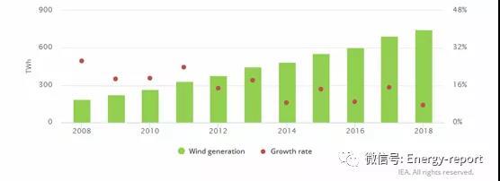 2018年,风力发电量为744.6TWh,同比增加7.5%,其中美国(274.8TWh)、德国(114.1TWh)、英国(56.6TWh)和西班牙(49.7TWh)领先。 风能为德国、英国和西班牙提供了18%的电量。增幅最大的是美国(+20.6TWh,+ 8.1%)、德国(+7.9TWh,+ 7.5%)和英国(+7.0TWh,+ 14.1%)。