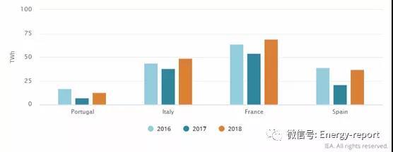 在经历了2017年的极度干旱(发电量减少)之后,欧洲西南部在2018年恢复了通常的水力发电水平。西班牙、葡萄牙、意大利和法国的水电发电量强劲增长,西班牙和葡萄牙去年的水电发电量几乎翻了一番。