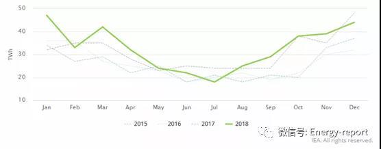 由于风流取决于压力梯度和气温,2018年的极端天气事件影响了风力发电,例如欧洲的夏季热浪影响,导致7月份大陆发电量下降,该月发电量低于2015年同期,即使三年间装机容量大幅增加。 1月和3月出现了非常高的发电高峰。最高和最低月发电量水平之间的差异是有史以来最高水平之一,最低发电量仅为最大值的38.3%。