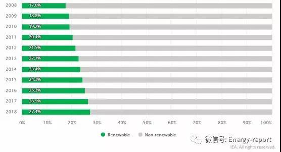 2018年电力部门发电量增长中,可再生能源发电占71.8%。自2008年以来,可再生能源在经合组织电力结构中的份额持续增长,增加幅度为9.8%,现已达到27.4%。