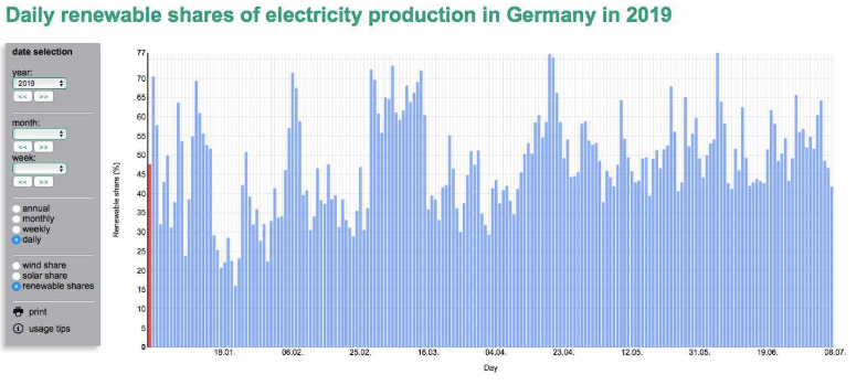 这里有一张有趣的图表,显示了可再生能源在前六个月以及7月至今的每日贡献。它表明,除了一两天之外,这一比例通常为30%至40%,并在6月8日创下77%的记录。