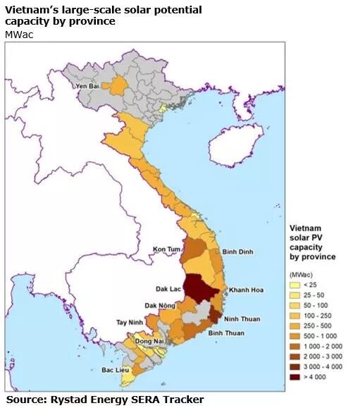 再加上,越南光照条件颇为优厚,拥有1600-2700年日照小时数,平均光照量4-5KWh/㎡,甚至高于中国I类资源区,富饶的光照条件已成为越南光伏投资的重要因素。