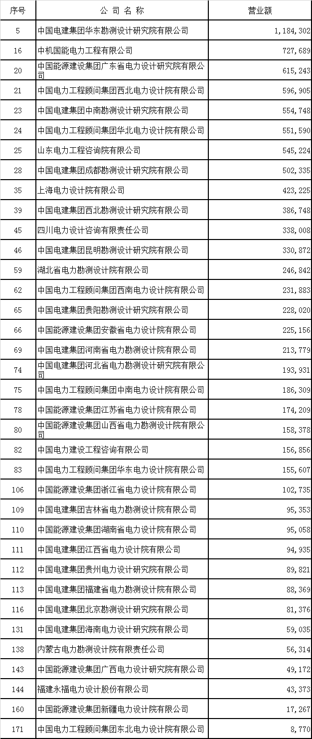 近日,中国勘察设计协会公布了《勘察设计企业工程项目管理和工程总承包营业额二〇一九年排序名单》,根据相关数据,对电力设计院排名进行了摘录,表中营业额为企业2018年1月1日至2018年12月31日境内外工程总承包营业额,序号为原表的全行业累加排序,仅供参考。详情如下工程总承包营业额2019年排名。
