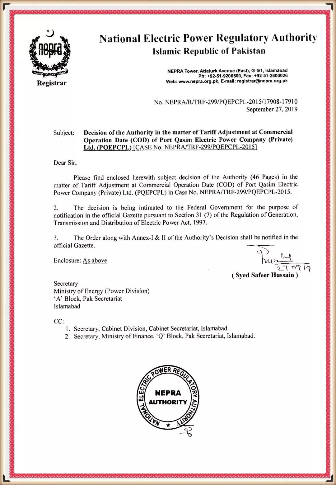 北京时间2019年9月27日23时,巴基斯坦国家电力监管局正式签发了《卡西姆港燃煤电站项目运营期电价核定批复》,标志着卡西姆项目进入全新的健康发展阶段,为新中国成立70周年献礼!