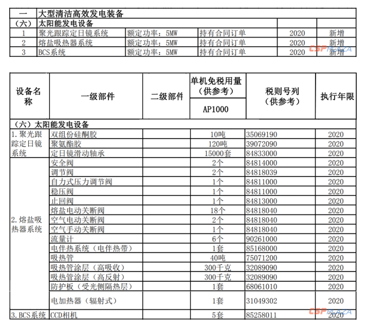 12月6日,财政部、工信部、海关总署、税务总局、国家能源局联合发布了《关于调整重大技术装备进口税收政策有关目录的通知》。其中,聚光跟踪定日镜系统、熔盐吸热器系统以及BCS系统三大光热发电相关装备作为大型清洁高效发电装备入列《国家支持发展的重大技术装备和产品目录(2019年修订)》(详见附件1)。