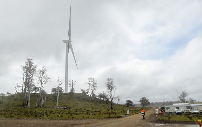 12月6日,在澳大利亚塔斯马尼亚州牧牛山风电项目现场,嘉宾共同启动首批风机并网发电。新华社记者 白雪飞 摄