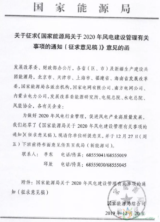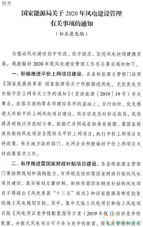 近日,国家能源局下发《关于征求2020年风电建设管理有关事项的通知(征求意见稿)的函》。