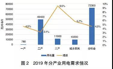 分产业来看,第三产业和城乡居民用电成为拉动用电需求的主力军(见图2)。2019年第一产业用电量为780亿千瓦时,同比增长4.5%,保持平稳增长;2019年第二产业用电量4.94万亿千瓦时,同比增长3.1%,占全社会用电量的比重同比降低0.9个百分点;2019年第三产业用电量1.19万亿千瓦时,同比增长9.5%,2019年城乡居民生活用电量1.02万亿千瓦时,同比增长5.7%,第三产业和城乡居民生活用电分别拉动全社会用电量增长1.5和0.8个百分点,合计拉动2.3个百分点,高于第二产业拉动的2.1个百分点。第三产业和城乡居民生活用电量对全社会用电量增长的贡献率合计达到51.0%,比第二产业对全社会用电量增长的贡献率高3.8个百分点,其中第三产业贡献率提高尤为明显,为10.1个百分点。