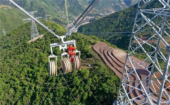 近日,在秦岭腹地的商洛市镇安县永乐镇孙家砭村,青海至河南±800千伏特高压直流工程跨越陕西秦岭段进入放线施工最后的冲刺期,即将全线贯通。施工现场环境保护和防疫措施严格,机械轰鸣,施工人员正忙碌着进行导线压接和展放作业,耸立山巅的一座座铁塔,错落有致,深向远方。