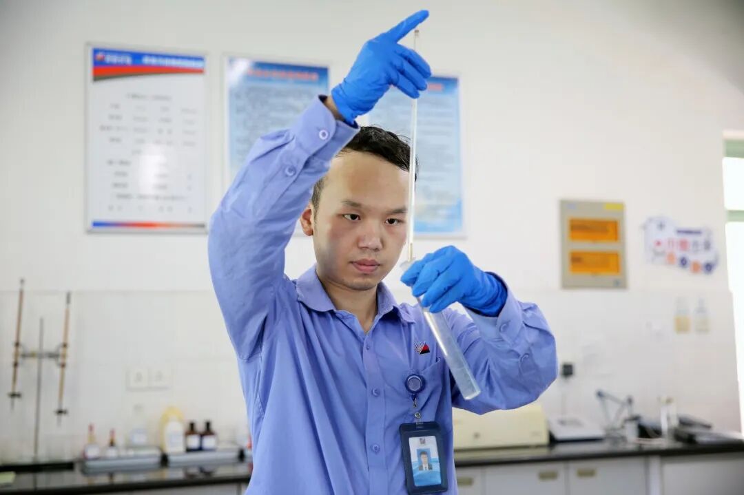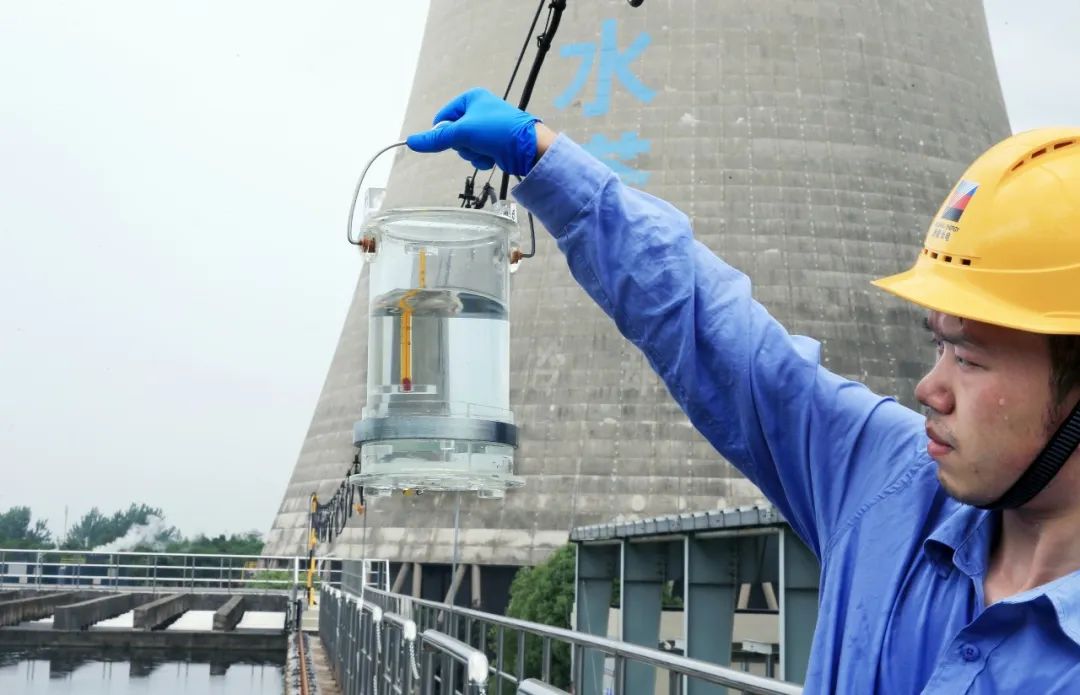 6月5日,浙能长兴发电有限公司化学专业人员正在观察中水系统处理后的水样。方磊 摄