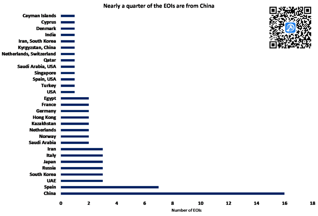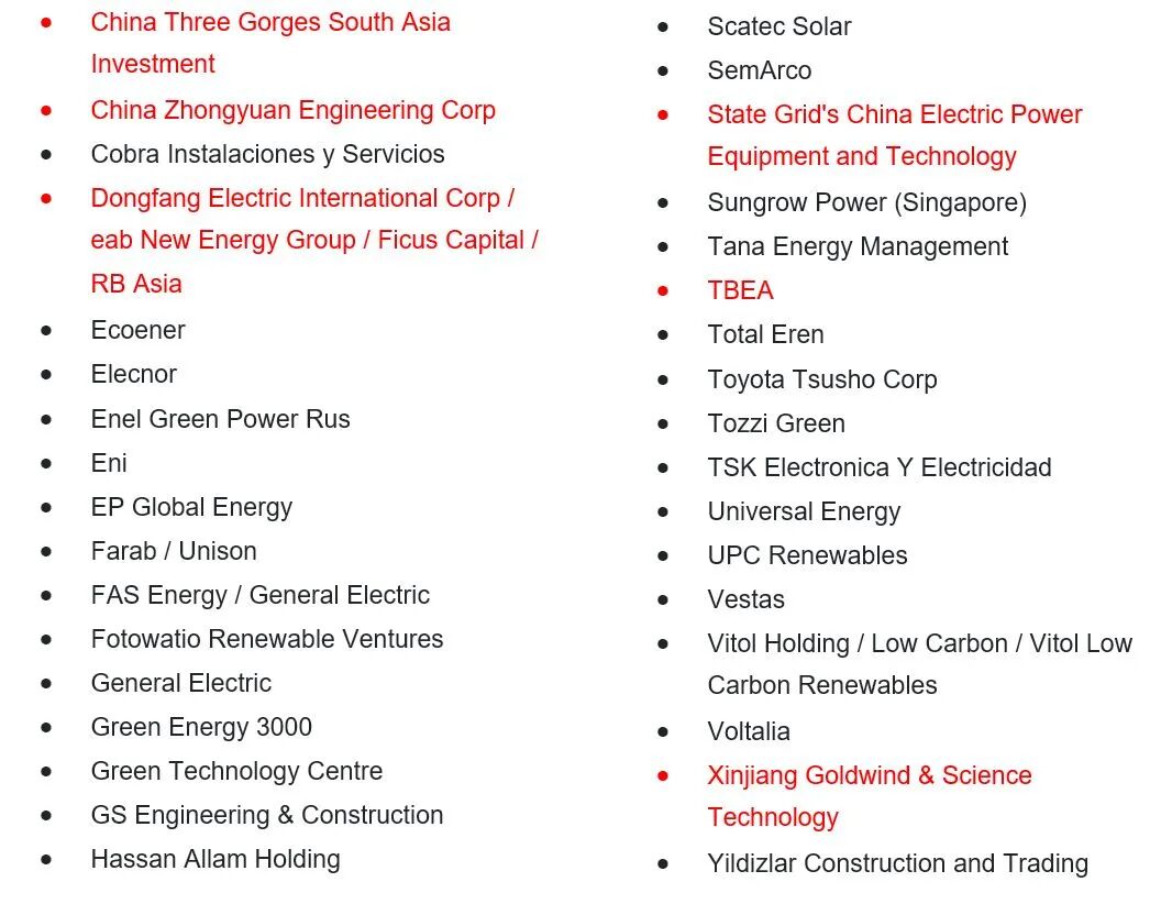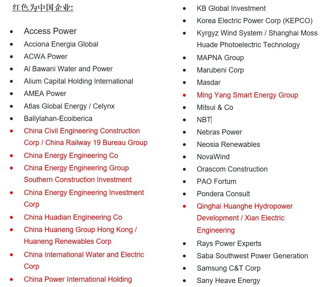 乌兹别克斯坦100MW风电IPP项目执行机构-乌兹别克斯坦能源部于今年4月发布招标公告,此后收到来自30个国家70个实体公司的意向书。70家意向单位中,近四分之一为中资企业,如下: