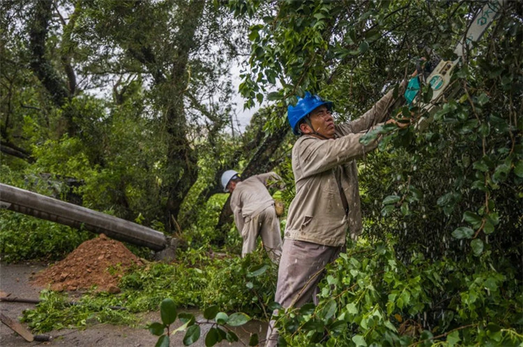 国网福建泉州惠安供电公司员工在被大风压断的10千伏虎窟线电杆旁紧急清理树木障碍。