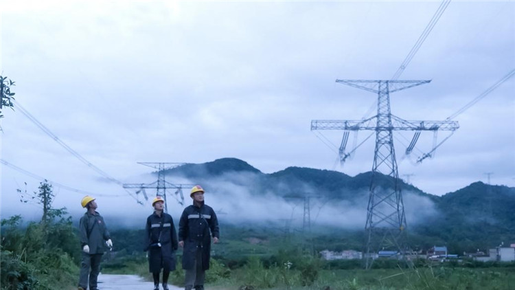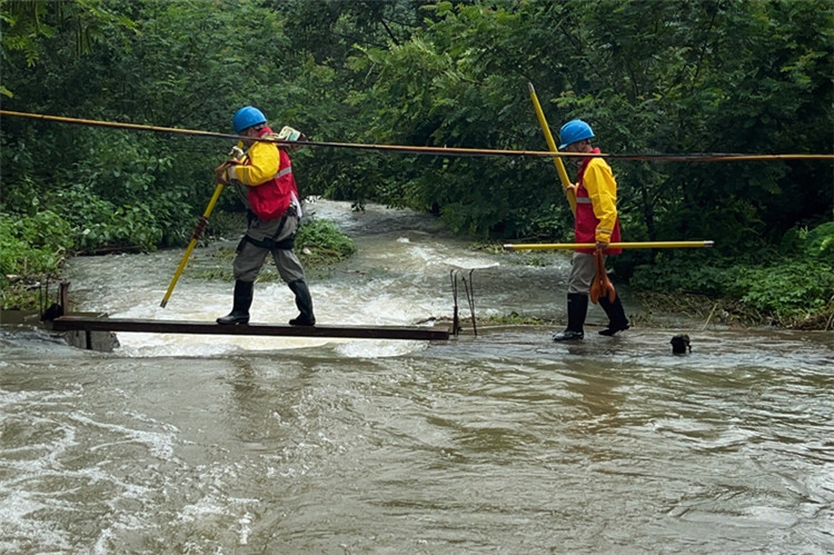 国网吉林送变电公司员工冒雨巡护山区线路。