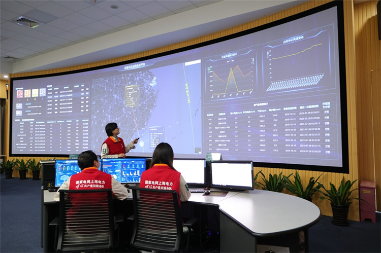国网上海电科院员工通过台风预警系统开展重要输电通道风速及降雨量监测分析。
