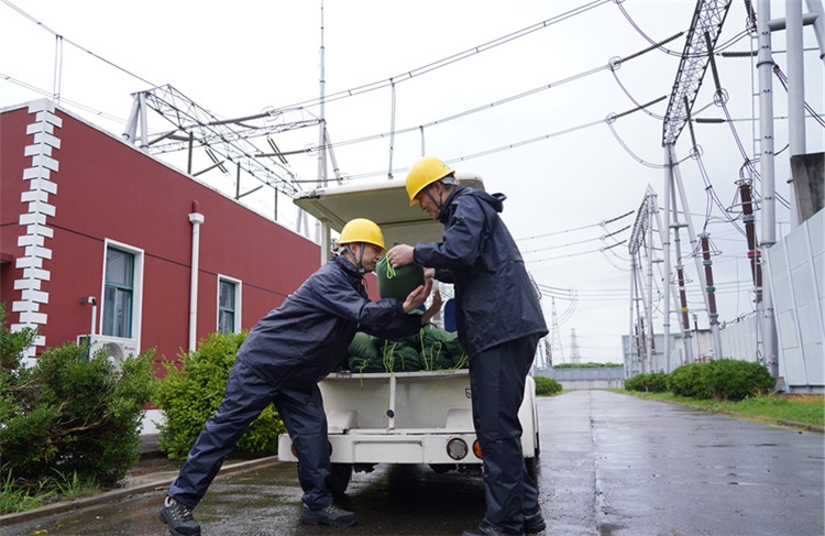 国网上海超高压公司员工在±500千伏南桥换流站开展防台风防汛准备工作。
