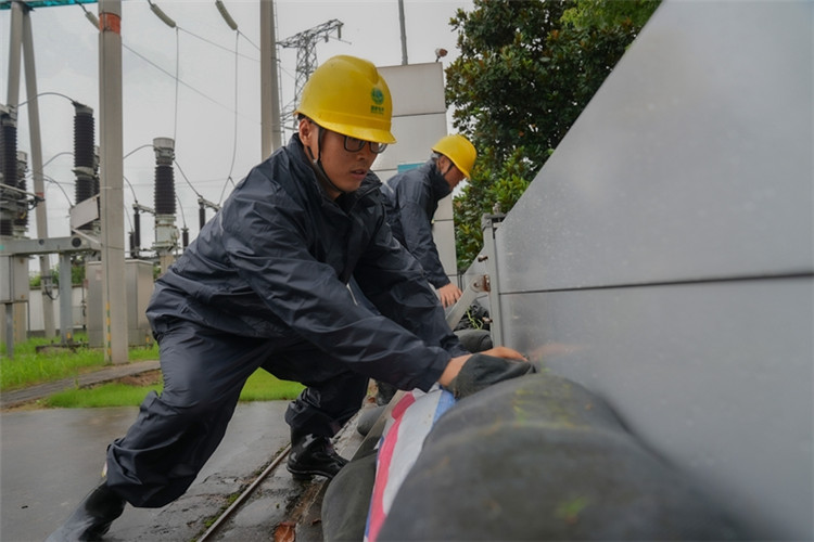 国网安徽宣城广德市供电公司在110千伏苏觉变电站内冒雨开展特巡工作,重点检查变电站内排水沟、设备室门窗、户外机构箱等设备。