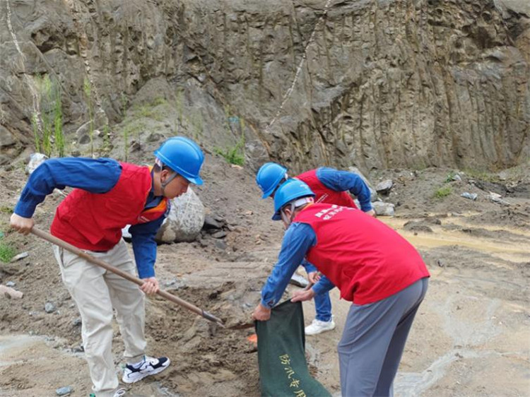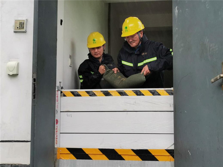 国网安徽安庆岳西县供电公司员工装沙袋加固城西变电站围墙,防范台风影响变电站设备安全运行。