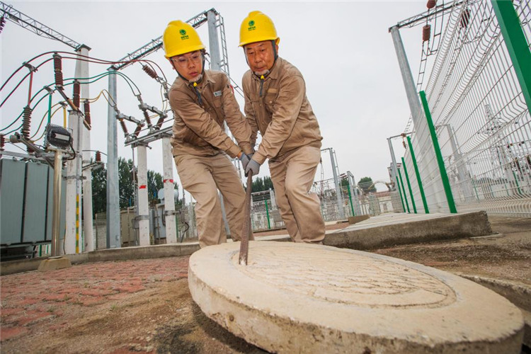 国网河南洛阳供电公司员工检查110千伏胜利路变电站站内排水口。