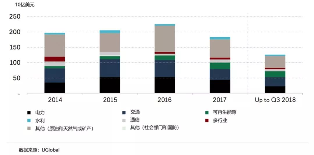 与2016年相比,2017年完成的融资水平有所下降,预计2018年也将略有下降(见图2)。这与银团贷款市场的数据一致,其2017年也出现了下降(见图3)。根据截至2018年9月的最新数据,2018年可能会继续小幅下滑。2014年至2018年9月的大部分已完成交易(43%)用于初级融资,与期限相对较短的亚洲基础设施融资一同考虑,这一数据表明未来几年再融资风险可能会更加突出。