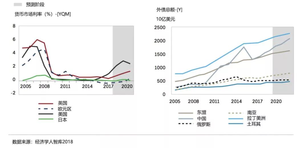 图1:2009年危机后一段时间低利率后利率上升,而外债总额似乎仍将增加