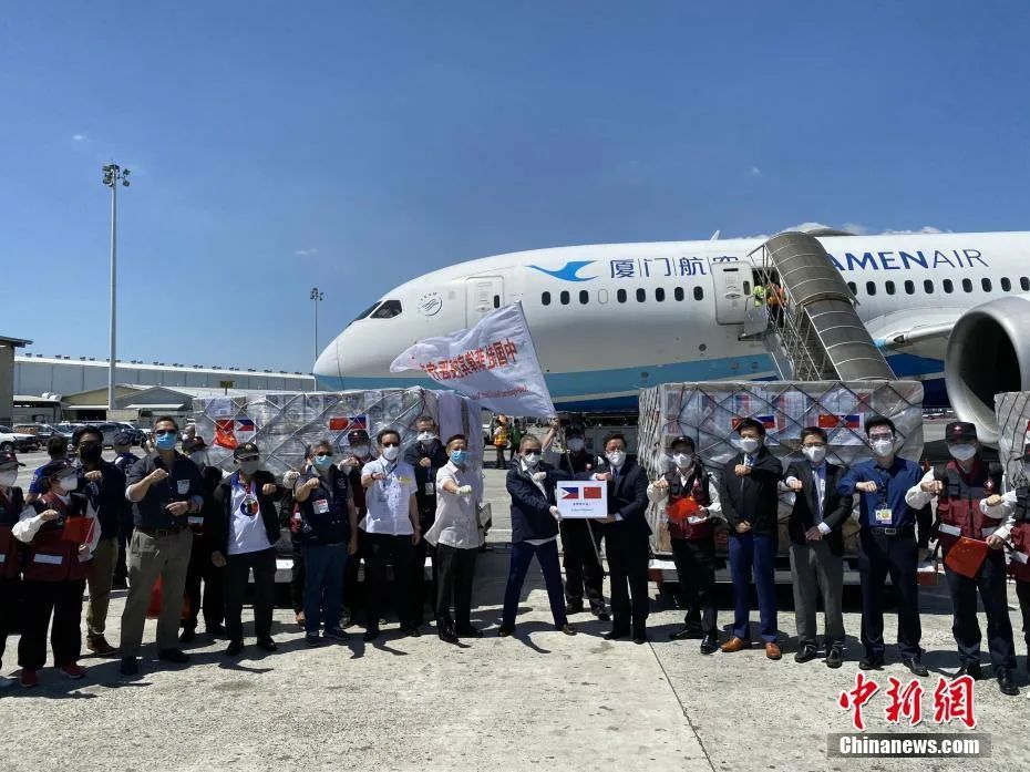 ▲4月5日,中国政府赴菲律宾抗疫医疗专家组一行12人抵达马尼拉,同机运抵的还有12吨中国援菲抗疫物资。图为中国驻菲律宾大使黄溪连(右六)和菲律宾外长洛钦(右七)出席在机场举行的物资交接仪式。(来源:中新网)